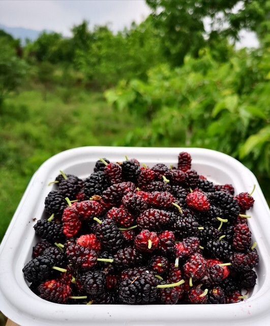 4月到6月是桑葚自然成熟的最佳时节,现在正是四五月份交接的时候,头茬桑葚最新鲜,糖分足、花青素最浓,口感酸甜多汁,根本没法跟大棚反季水果比。而且桑葚的鲜果期很短,一年就那么两三个月,四月五月不吃,真要再等一整年。