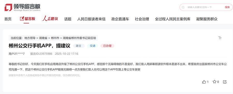 人民网长沙11月5日电 (记者刘宾)近日,有网友在人民网“领导留言板”向湖南省郴州市委书记留言,称自己是盲人,在手机应用商店升级了“郴州公交行”APP后,上面的一些功能用屏幕朗读软件读不出来,希望相关单位能跟进解决,方便盲人出行时使用。