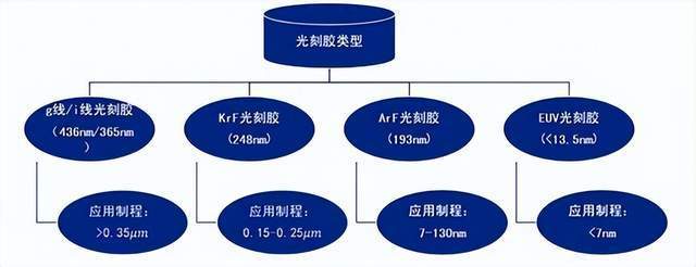 而光刻胶是分为g线、i线、KrF、ArF和EUV这么5类,对就的是不同的芯片制造工艺,具体点来讲,是工艺越先进,难度越大,日本在这一块的占有率就越高。
